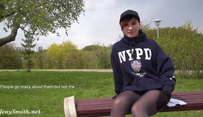 Jeny shows her new Wolford seamless pantyhose in the public place outdoor.